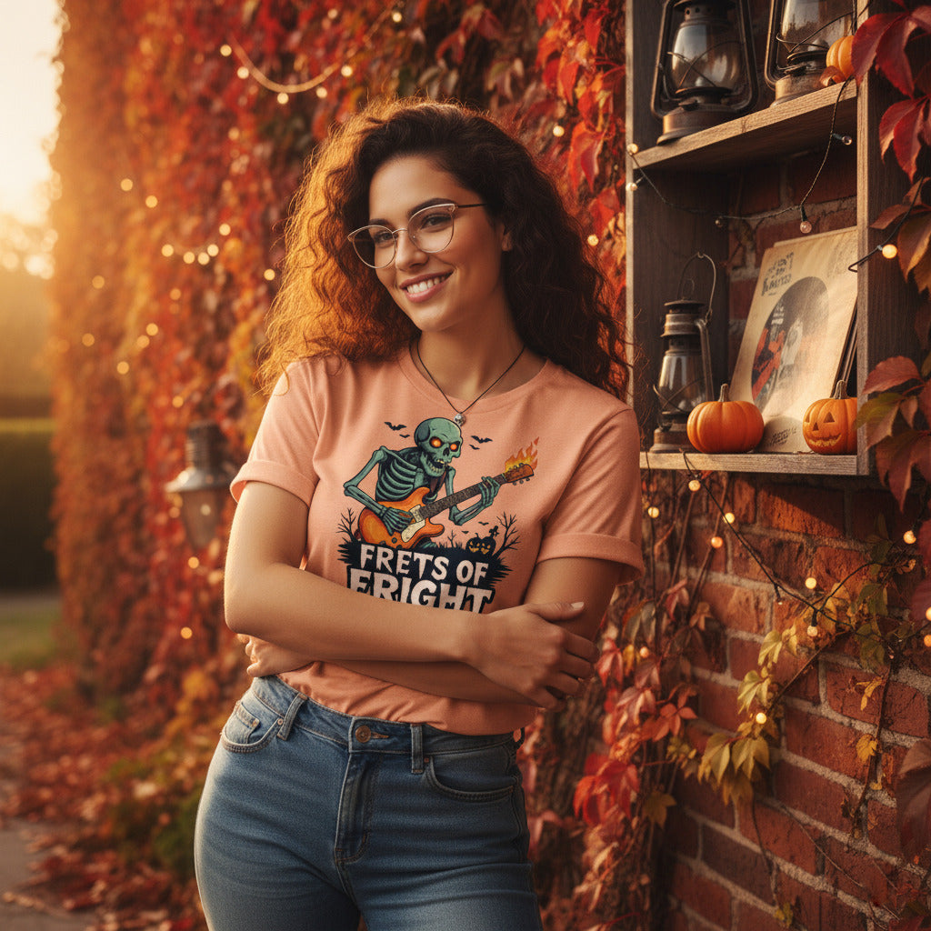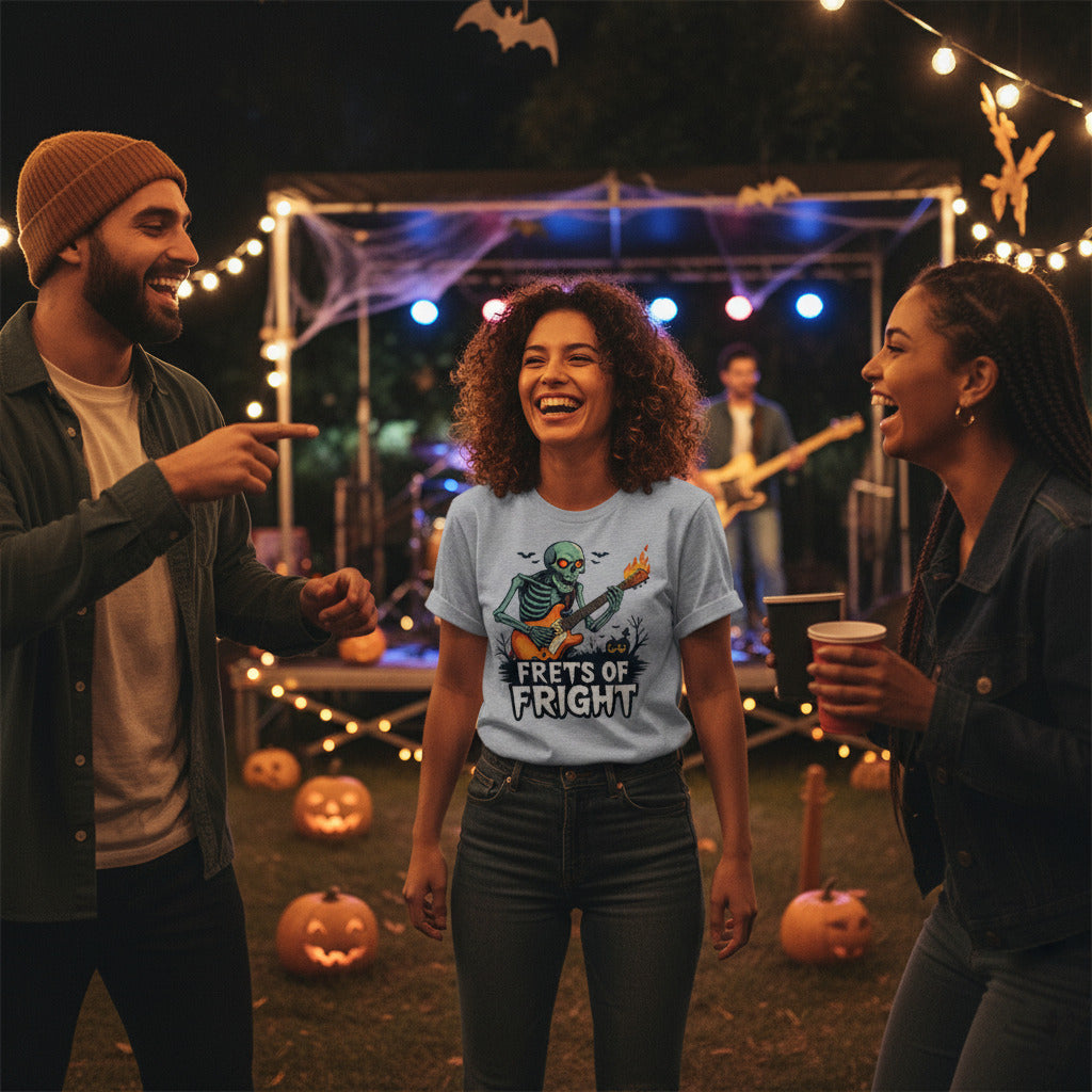 Frets of Fright T-Shirt, Skeleton Guitar Halloween Tee, Flaming Skull Rock Shirt, Heavy Metal Gift, Spooky Music Apparel