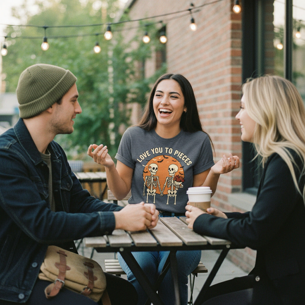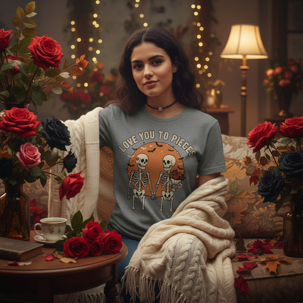 Declare your undying love with this "Love You To Pieces" skeleton couple t-shirt. Mixing dark humor with heartfelt romance, this design is perfect for couples who embrace both the spooky and the sentimental side of life.