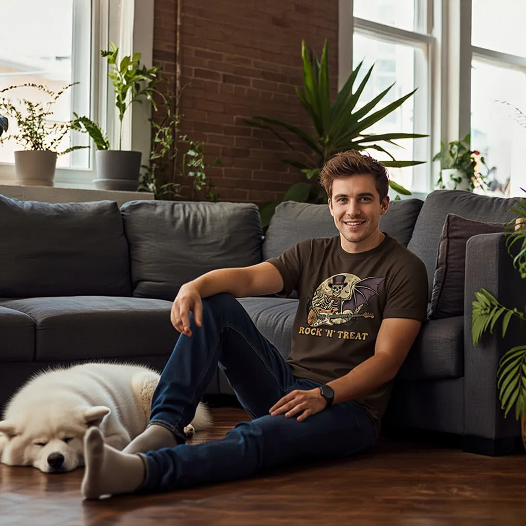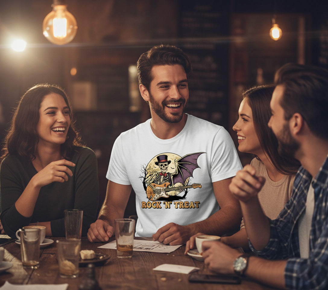 Get ready to rock and treat with this bold skeleton guitarist tee. Featuring a skeleton shredding on a bat-winged guitar, this design perfectly blends heavy metal energy with spooky Halloween vibes.