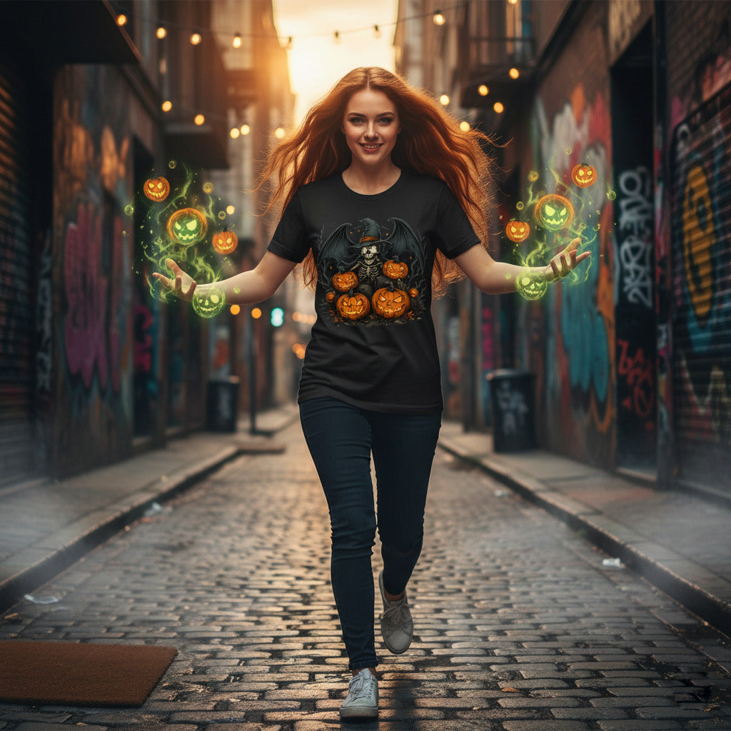 Light up the night with this bold skeleton witch hat t-shirt. Surrounded by flaming torches and carved jack-o'-lanterns, this design captures the fiery spirit of Halloween with a gothic twist.